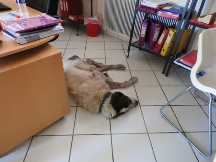 Tina is a senior giant dog who was found wandering in the industrial suburbs of Athens, Greece. The poor canine was exhausted, starving, and was suffering from mange. Tina found her way into an office of an industrial company, and she lay on the floor. The poor canine became weak and could go no further.