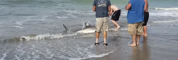 A group of men helped a baby great white shark at Capistrano Beach Park in Dana Point on Saturday.