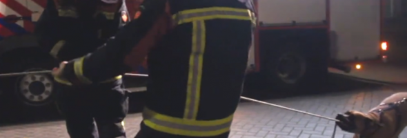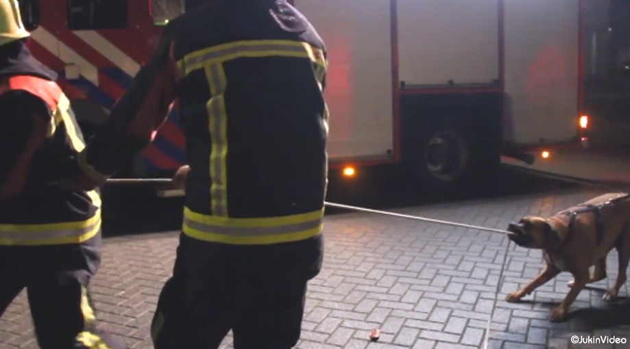 This brown dog helped by tugging on the rope as hard as it could along with the firemen
