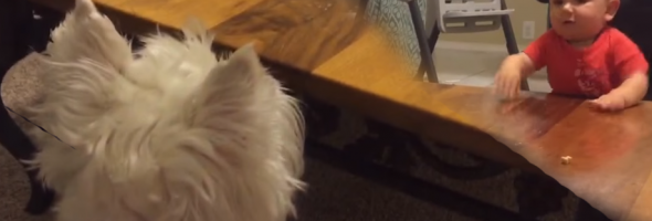 Baby Sam was standing by the coffee table, banging it hard, and just doing the things babies do. His dog, Beau, was standing on the other side, staring, not at Sam but at a piece of chicken in the middle of the table. It’s actually quite funny because the dog is standing and staring as if they’re about to have a final showdown for who gets the chicken. All the video is missing is the classic western shootout music and tumbleweed rolling in the background.