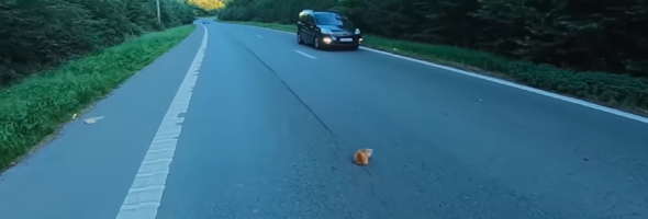 The two ran back to where they had seen the cat and waved at traffic to avoid the terrified orange kitten. Quentin runs into the middle of the road and gently picks up the kitten to carry it to safety.