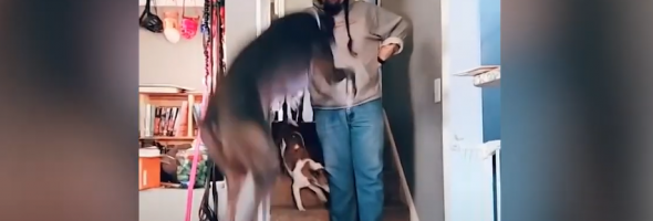 An English greyhound named Falcon saw that his owner had changed his clothes that is why he thought that they would soon go for a walk, which made him show his enthusiasm without a hint of shame.