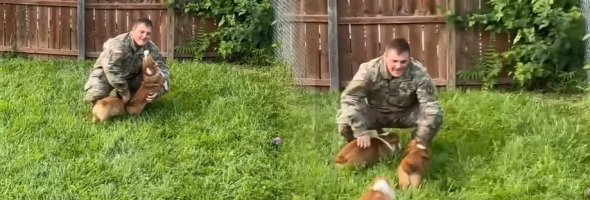 Our three corgis hated his absence, so they were very happy when he returned home after two weeks of training.