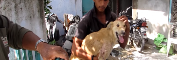 The rescuers took the dog to the rescue shelter. A vet treated her and given a clean bill of health. The dog has a new temporary home full of love and she looks happy. We wish to thank Animal Aid for their selfless act.