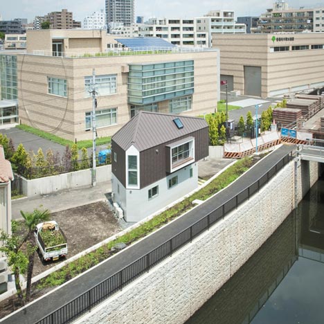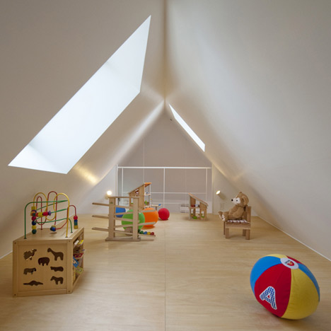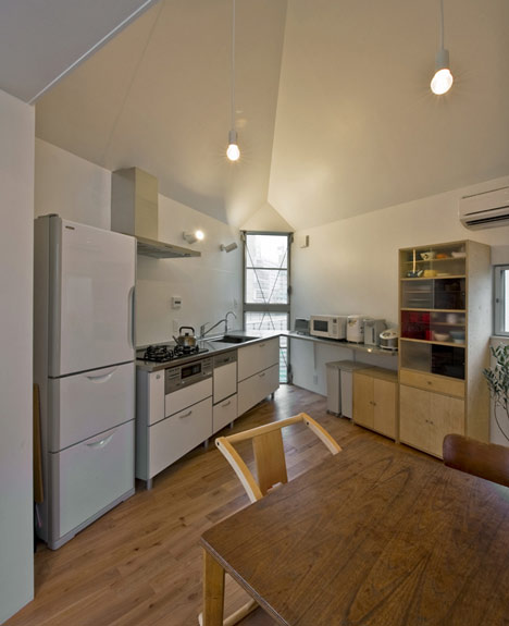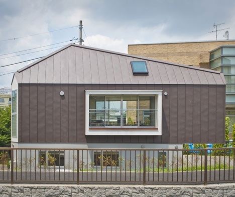 This small house with a triangular floor plan sits on a narrow sliver of lot wedged between a road and a river channel in west Tokyo. Designing the house for a couple and their young daughter, Mizioshi Architect Atelier maximized the interior space by pushing the walls and roof to the limits of the permitted building envelope.