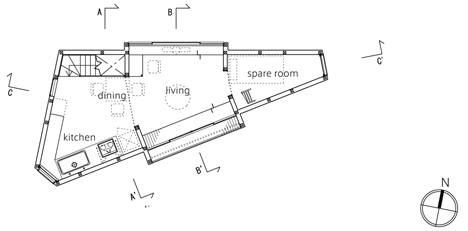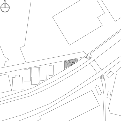 This is a very small house built on the triangle site where the river and the road were crossed and made to the acute angle.