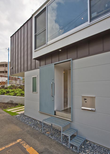 The steel-clad upper floor of the two-storey House in Horinouchi cantilevers forward to create a small sheltered car parking space below.