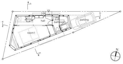 The building is the form that cut an acute angle part on a triangle plan derived from the site. Furthermore,it got the maximum volume of hip roof of three planes in restriction of setback-line.